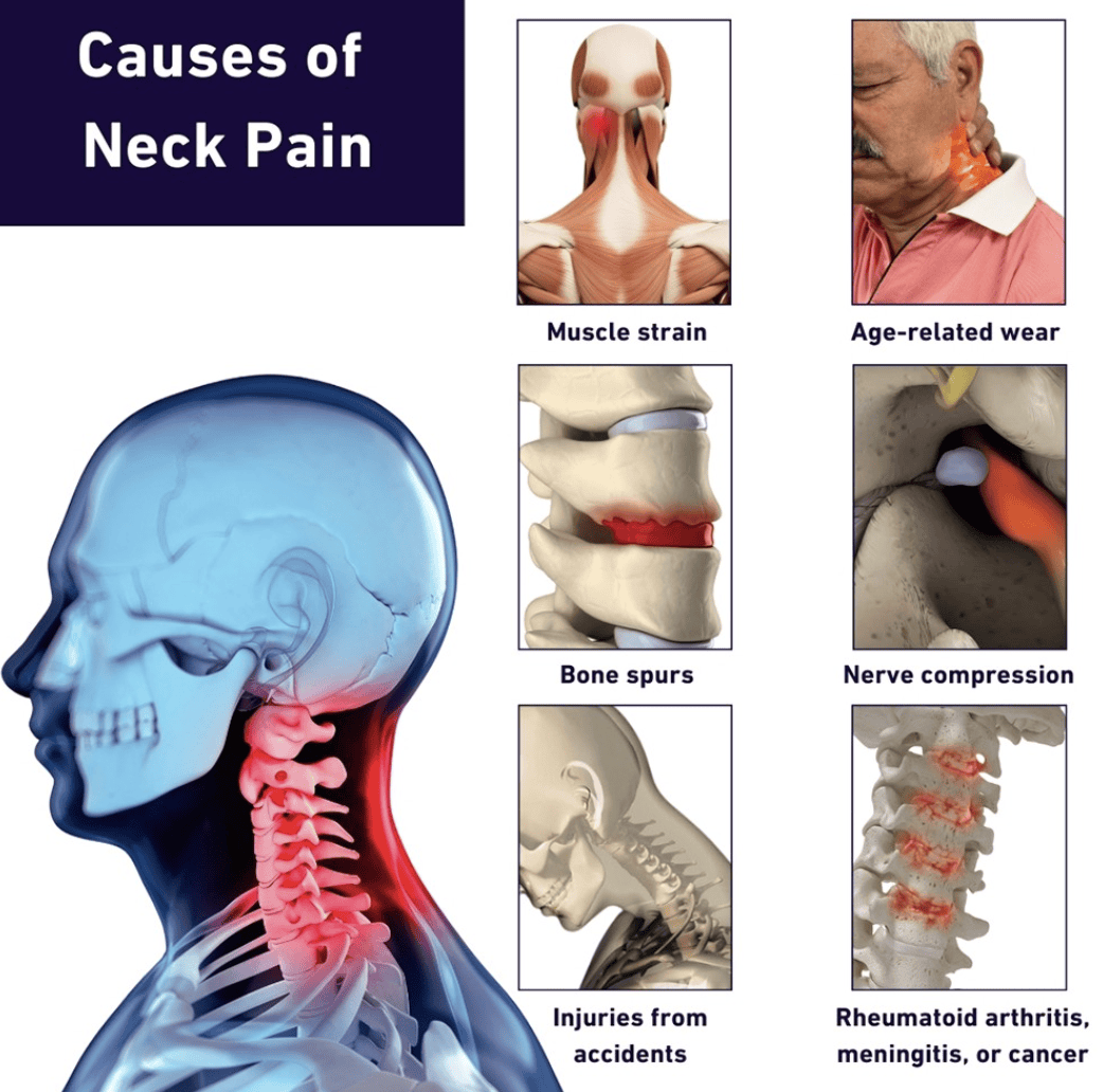 Neck pain can be caused by many different things: Stress, poor posture, injuries, muscular dysfunction, and other items.